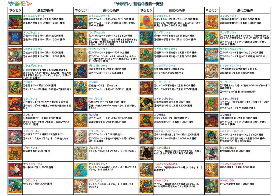 A.進化の条件はすべて「そのカードに限った」条件です。したがって、たとえば「国語で累計300P」という条件であれば「国語の勉強を実行した時に得られたポイントの累計」ということになります。数学など他のやるモンの進化には使えません。また、ポイントを貯めるのに日数が必要なので、ゲームボードの「進化チャレンジ中のモンスター」欄を途中経過の記入用に使ってください。